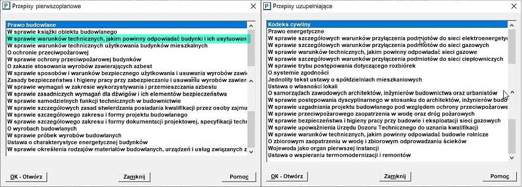 W programie PRZEGLĄD zawarliśmy 38 aktualizowanych na bieżąco przepisów, opracowanych w formie hipertekstu, które łączą się bezpośrednio i pośrednio z procedurami kontroli obiektów budowlanych. Źródłem wiedzy są także: orzeczenia sądów i pisma Głównego Inspektora Nadzoru Budowlanego, które są także dostępne w programie PRZEGLĄD.