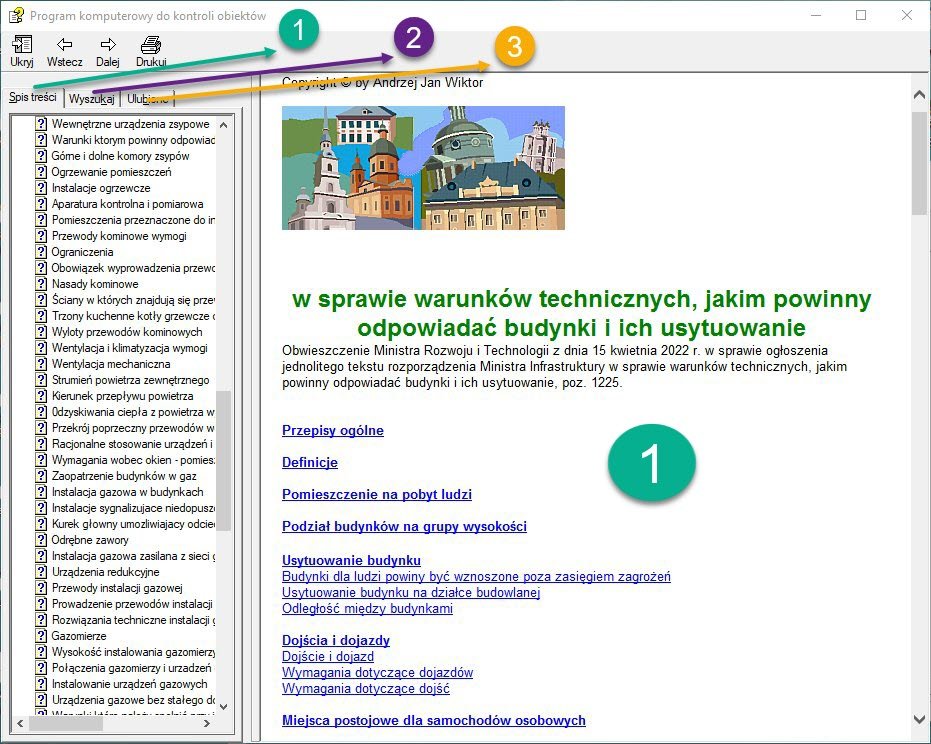 Zbiór przepisów został podzielony na dwie grupy: „Przepisy pierwszoplanowe" i „Przepisy uzupełniające". Przepisy opracowane są w formie hipertekstowej, w konwencji plików CHM. Czytnik plików CHM rozpoznaje hiperłącza, które są stosowane m. in. na głównej stronie przepisu (znacznik nr 1), zawiera wyszukiwarkę (nr 2) i możliwość zachowania fragmentów tekstu (nr 3).
