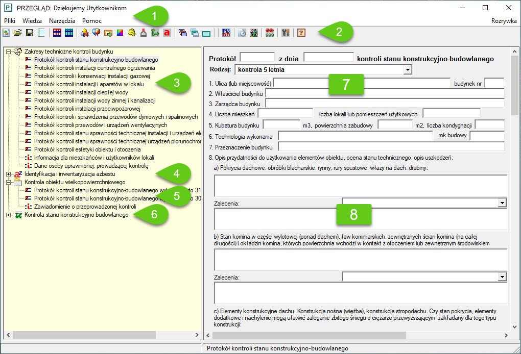 Główne okno programu zawiera zbiór formularzy (znaczniki od 3 do 6), ułożonych w formie rozwijalnej listy, umiejscowionych w lewej części. Przeglądając ten fragment okna, na obydwu zrzutach ekranu (screenach - używając języka młodzieży), można się zorientować, jakie protokoły są od razu dostępne. Protokoły dla nietypowych obiektów można utworzyć samodzielnie przy pomocy polecenia „Kreator formularzy" z menu „Narzędzia".