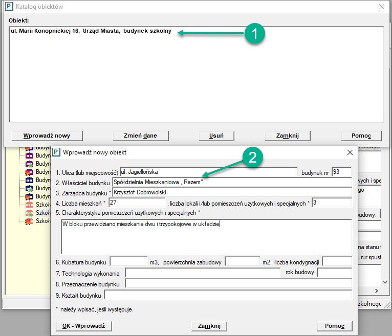 Po wybraniu komendy „Katalog obiektów" z menu „Narzędzia" lub po naciśnięciu na właściwą ikonę przywołamy okienko, w którym można dopisać, zmienić lub usunąć podstawowe dane o obiekcie. Podstawowe dane o obiekcie to te, które znajdują się w początkowej części protokołu: „ulica (lub miejscowość)", „budynek nr", „właściciel budynku", „zarządca budynku", „liczba mieszkań", „liczba lokali i/lub pomieszczeń użytkowych i specjalnych", „charakterystyka pomieszczeń użytkowych i specjalnych", „kubatura budynku", „powierzchnia zabudowy", „liczba kondygnacji", „technologia wykonania", „rok budowy", „przeznaczenie budynku", „kształt budynku". Po dopisaniu podstawowych danych obiektu do katalogu, można automatycznie umieścić jego dane w początkowej części protokołu. Na screenie pokazanym niżej strzałka nr 1 wskazuje dane już utworzone, natomiast strzałka nr 2 dane w fazie tworzenia.
