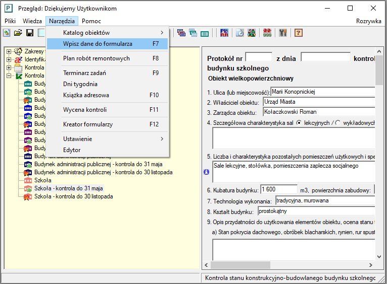 Komenda z menu „Narzędzia": „Katalog obiektów/Wybierz obiekt" służy do wybierania obiektu, którego dane podstawowe będą automatycznie wpisywane do otwartego formularza protokołu. Można w tym celu także wybrać ikonę lub skrót z klawiatury F7.