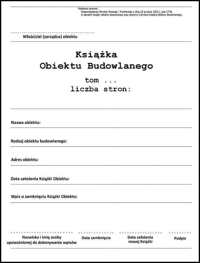 Strona tytułowa Książki Obiektu Budowlanego powinna mieć określoną (jak w rozporządzeniu z dnia 15 grudnia 2022 r., poz. 2778) formę: powinna zawierać podstawowe informacje o obiekcie budowlanym i samej Książce tego obiektu, a także należy podać liczbę stron, którą, jak już wspomniałem, ustala właściciel lub zarządca. Konieczność podania liczby stron na stronie tytułowej Książki jest nowością ostatniego rozporządzenia.