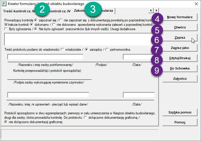 Gdy wybierzemy przycisk „Zapisz" (nr 6), wpiszemy treść formularza do pliku - otwartego wcześniej lub niedawno utworzonego. Naciśnięcie na przycisk „Zapisz jako" (nr 7), spowoduje zapisanie treści protokołu do nowego pliku (pod nową nazwą): nie jest istotne czy protokół został wcześniej otwarty z innego pliku, czy jest nowo utworzony. Przyciskiem „Otwórz" (nr 5) otwieramy już istniejący protokół. Wybór przycisku „Nowy formularz" (nr 4) skutkuje wyczyszczeniem pól w panelach, następnie możemy rozpocząć ponowne wpisywanie danych. Przyciski „Edytuj/Drukuj" (nr 8) i „Do Schowka" (nr 9) umożliwiają przeniesienie danych do dowolnego, wybranego wcześniej edytora.