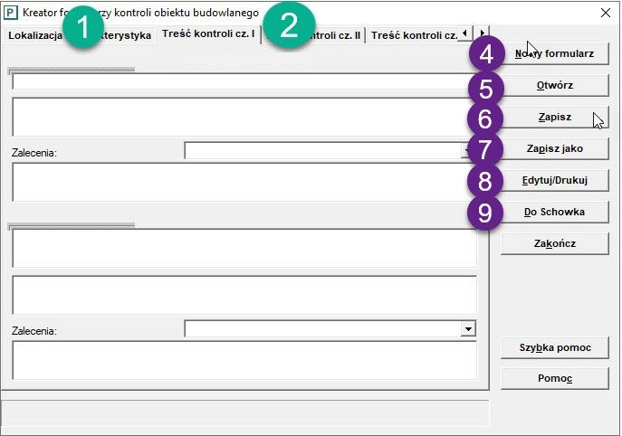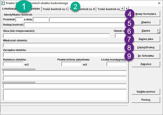 Kreator jest prostym narzędziem ułatwiającym tworzenie wzorców formularzy kontroli dla rzadko spotykanych obiektów. Najpierw wpisujemy numer (lub symbol) protokołu, datę, nazwę - adekwatną do rodzaju i przedmiotu kontroli, na przykład: „Protokół kontroli w zakresie konstrukcyjno-budowlanym przejścia podziemnego"; później - lokalizacja obiektu, dane dotyczące właściciela i zarządcy są tworzone w dalszej kolejności (oznaczenie nr 1). Następnie wpisujemy dane charakterystyczne dla obiektu - jeśli występują: kubaturę obiektu, powierzchnię zabudowy, liczbę kondygnacji; sami określamy jakie inne dane charakterystyczne o obiekcie zapisać (nr 1). Treść kontroli wpisujemy w czterech panelach, w każdym panelu można wpisać dwa tematy, łącznie osiem zespołów (nr 2). Zakończenie formularza zawiera elementy, które także występują w większości protokołów znajdujących się w drzewie programu „Zakresy kontroli" (symbol nr 3).