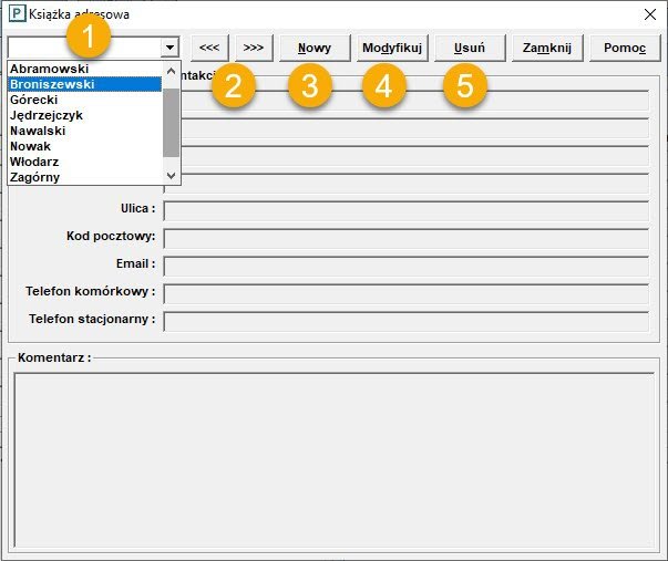 Wprowadzenie nowej osoby jest bardzo łatwe - wybieramy w tym celu przycisk „Nowy" (nr 3). W kolejnym okienku, które się pojawi, dokonujemy zapisu. Dodatkowe informacje oraz historię kontaktów należy wpisać do pola tekstowego w dole okienka. Ponownie przechodzimy do pierwszego okienka - jednocześnie akceptując wpisane informacje - wybierając przycisk "OK - Zatwierdź". Nowy kontakt został dopisany do bazy, a nazwisko jest widoczne - w porządku alfabetycznym - w liście rozwijalnej. Zmodyfikowane okno, po wpisaniu nowej osoby, jest pokazane na samym dole.