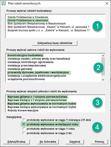 „Plan robót remontowych", jak wskazuje nazwa, umożliwia wykonanie planu robót remontowych, bazując wyłącznie na protokołach utworzonych dla danego obiektu przez osoby uprawnione. W każdym wypełnianym elektronicznie protokole znajdują się listy rozwijalne, a w nich zalecenia dotyczące robót remontowych, zgodne z klasyfikacją zawartą w rozporządzeniu „w sprawie warunków technicznych użytkowania budynków mieszkalnych", z podziałem na stopnie pilności: naprawa główna - 2 kategorie, naprawa bieżąca - 2 kategorie, roboty konserwacyjne. Przed wykonaniem planu należy wybrać: obiekt budowlany (nr 1), zakres robót (nr 2), stopień pilności (nr 3), a także wskazać - wybierając właściwy przycisk opcji, które protokoły mają być uwzględniane, wykonane w ciągu: ostatniego miesiąca, w bieżącym roku, w ciągu 1 roku czy 2 lat (nr 4).