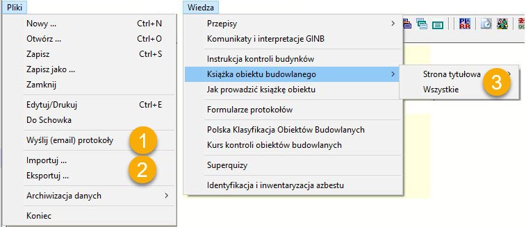 W menu Plik można wykorzystać komendę: „Wyślij (email) protokoły" (symbol nr 1), która ułatwia wysłanie poczty elektronicznej z dołączonymi protokołami, co pozwala na szybką wymianę dokumentacji pokontrolnej; właściciel lub zarządca mogą w krótkim czasie uzupełnić wiedzę o stanie technicznym obiektu.